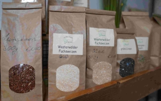 Das hofeigene Sortiment kann sich sehen lassen. Kartoffelanbau gibt es seit 2010 und bringt zumeist drei Sorten, mitunter auch besondere Spezialitäten in den Verkauf. Vorwiegend alte Sorten von Speisegetreide, aber auch Hülsenfrüchte und Speiselupinen, Ölfrüchte wie Raps und Lein sind ebenfalls im Anbau und werden ab Hof vermarktet. Brot aus eigenem Mehl ist mit im Angebot, saisonal auch Kürbis und Zucchini. Es wird gerne auch mit neuen Anbauideen experimentiert und wenn Gemüseanbau von Zwiebeln erfolgreich läuft, erweitert sich das Angebot.